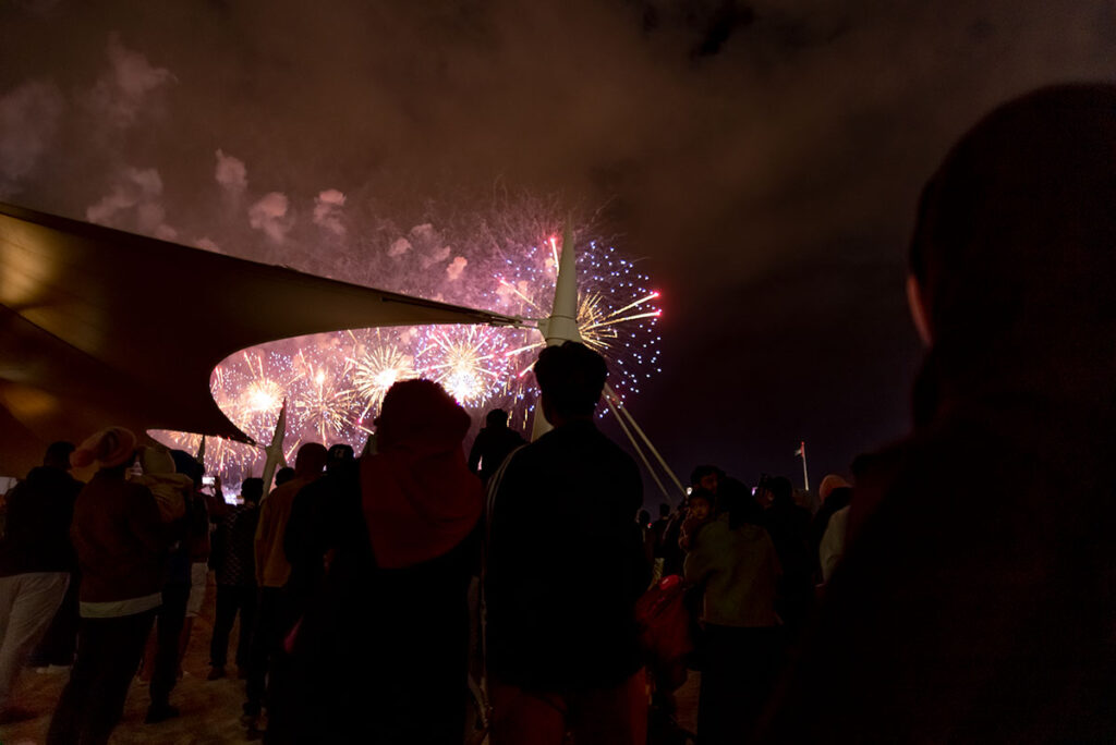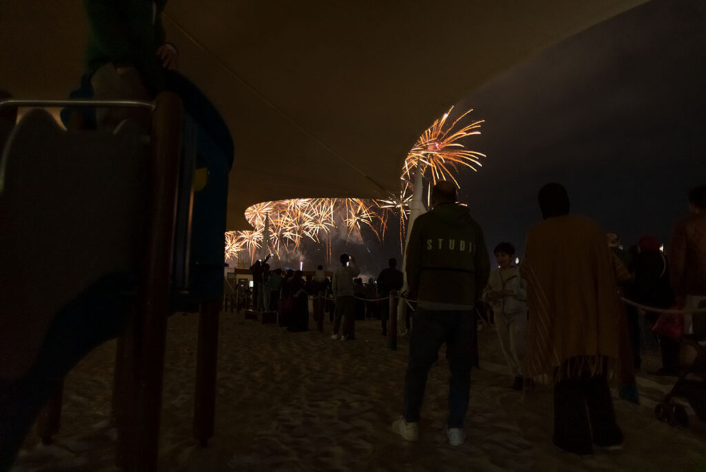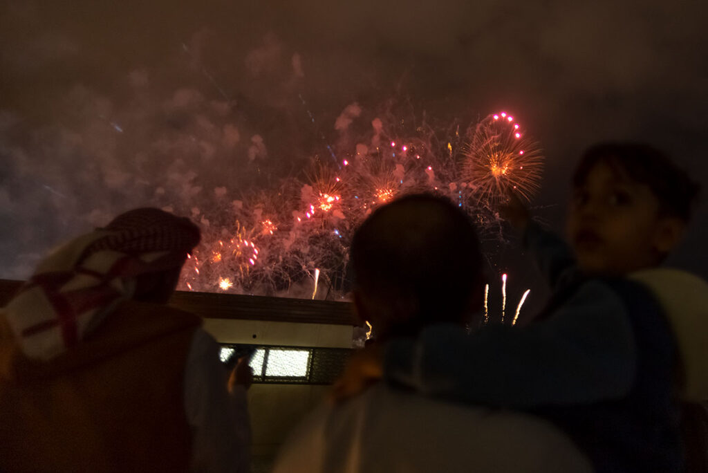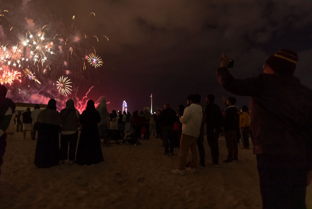 Gestern, in der Silvesternacht, am Strand von Abu Dhabi, knapp 140 Kilometer westlich von Dubai, wurde ich erstmalig Zeuge der berühmten arabischen Gastfreundschaft. Anderthalb Stunden vor Beginn des Feuerwerks suchte ich nach der besten Stelle, um ein paar farbenfrohe Fotos mitzunehmen, als mich plötzlich ein kleiner Junge in die Seite stupste. Er gehörte zu einer Gruppe von drei schwarz verhüllten Frauen und einem Mann, Mitte Zwanzig. Auf die Frage, was denn in dem kleinen Becher sei, den er mir freudestrahlend entgegenhielt, rief er fröhlich: „Chai Karak“. Eine der Frauen übersetzte das für mich ins Englische: schwarzer Tee mit Milch, Zucker und Zimt. Im Grunde also nicht viel anders, als Briten ihren Tee genießen.