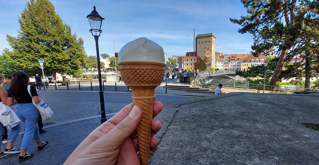 Über die Neiße führt die Altstadtbrücke hinüber in den polnischen Teil der Stadt. An beiden Enden gibt es jeweils eine Eisdiele, ich empfehle jedoch die auf der polnischen Seite, dort wird das Eis nämlich selbst zubereitet und ist ausgesprochen köstlich.