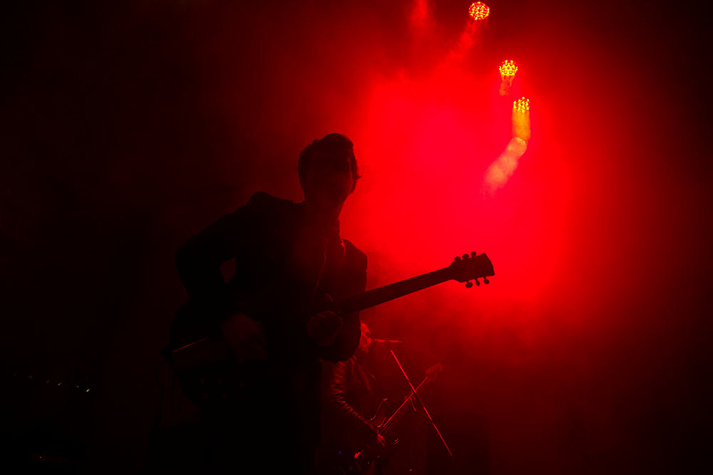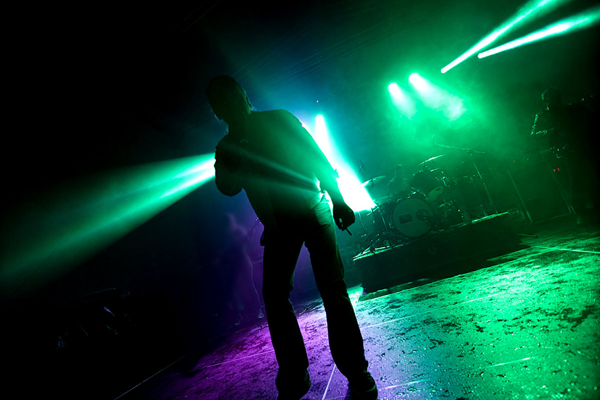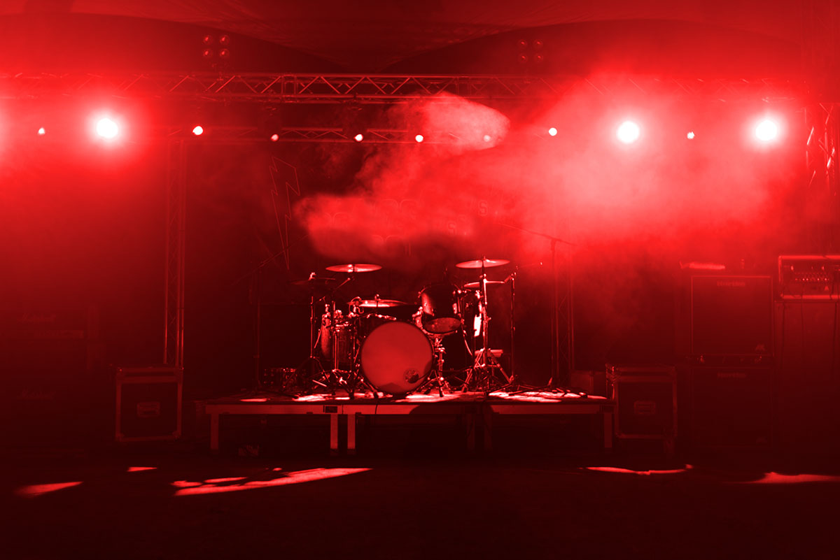 Nur noch wenige Meter, das Atmen fällt ihm schwerer, die sich spannende Haut schnürt die Luft ab, presst das vernarbte Herz zusammen, das hektisch versucht, sich den Weg freizuschlagen, so wie er auch, vorbei an schwarzen Kisten mit Rollen darunter, gefüllt mit grauen Schaumstoffkissen, in denen sonst die wertvolle Technik sorgsam gebettet dem nächsten Konzert entgegenrollt, von Ort zu Ort, jetzt jedoch den hinteren Rand und die Seiten der Bühne ziert, aufgewärmt, wartend, bereit für den ersten Ton, den es zu verzerren gilt, oder verstärkt weiterzureichen, über Kabel, so bunt wie die Kostüme des Glam Rocks, damals in den Siebzigern, weiterzugeben an die PA des Kreiskulturhauses „Franz-Joseph Grummelmann“, die nun, fachmännisch eingemessen, das Klanggeschehen der ehemals glorreichen und nun so grauenhaft abgehalfterten Band mit nahezu perfektem Klang an den Raum übergibt, gefüllt mit Luftmolekülen, welche kunstvoll komprimiert und expandiert in die Ohren des erwartungsvoll fiebernden Publikums dringen mögen.