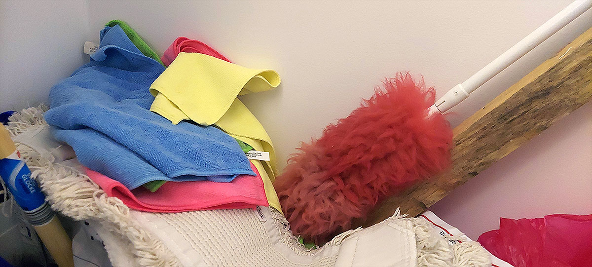Als wären mein dreifacher Hinweis nie geäußert worden, lief er anschließend zu den Toiletten, und – damit fertig – in die Büros, um nun hemmungslos mit denselben Gummihandschuhen und Lappen die potentiell gefährlichen Keime des Feuchtbereichs auf Tischen und Schränken zu verteilen.
