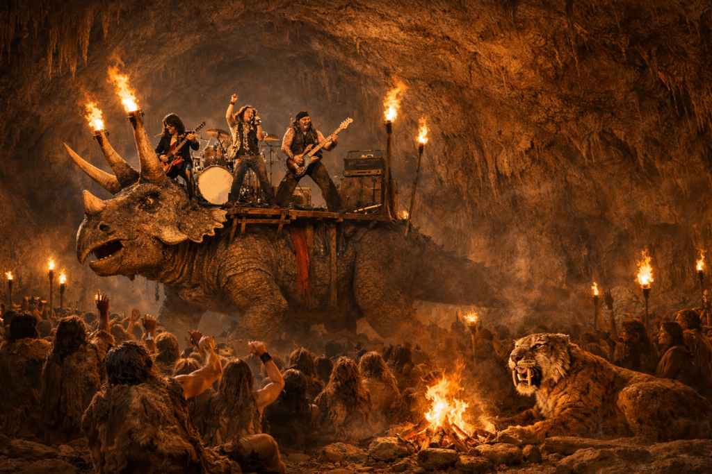 Statt mit dem Tourbus ritten die Musiker auf Dinosauriern zu den Konzerten. Der T-Rex erwies sich als unpraktisch für den Bühnenaufbau, überzeugte aber im Bassbereich, während der immermüde Triceratops eine stabile Plattform bot. Konzerte fanden bevorzugt in Höhlen statt, nicht aus Nostalgie, sondern wegen des hervorragenden Nachhalls. Das Publikum bestand aus frühen Menschen, vereinzelten Neandertalern und gelegentlich einem Säbelzahntiger, der eigentlich nur wegen des angenehm wärmenden Lagerfeuers vorbeigekommen war. Applaus äußerte sich meist in zustimmendem Grunzen und brachialer Gewalt auf den After-Stage-Partys, was aus nostalgischen Gründen bis heute beibehalten wurde. Ebenfalls bis heute beibehalten wurde das offenherzige Verhalten vieler Groupies, deren Hauptaufgabe es damals war, die Anzahl potentieller Konzertbesucher langfristig zu erhöhen.