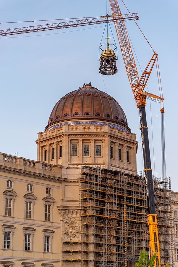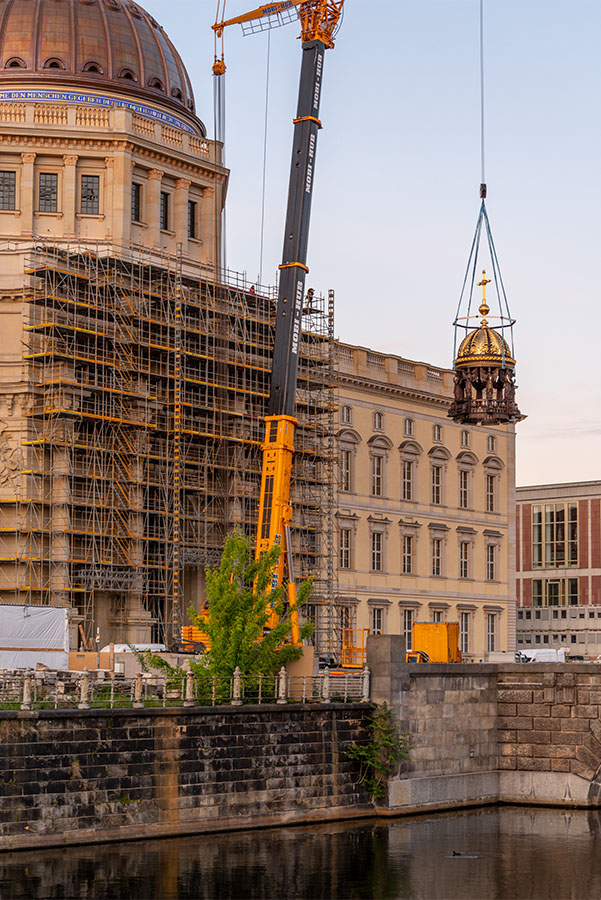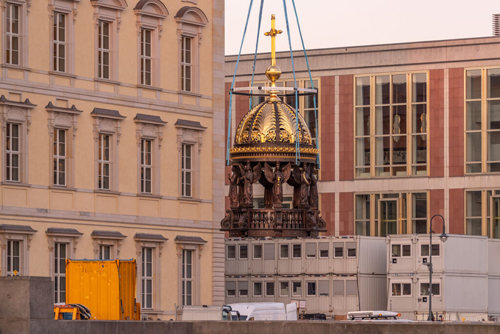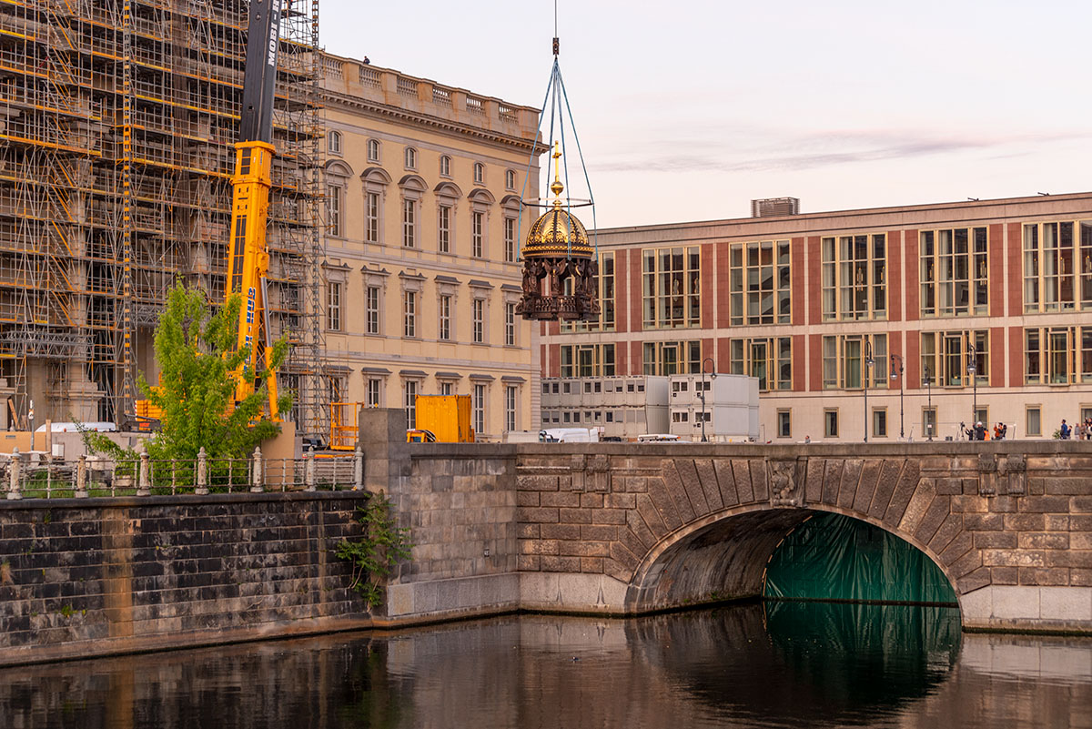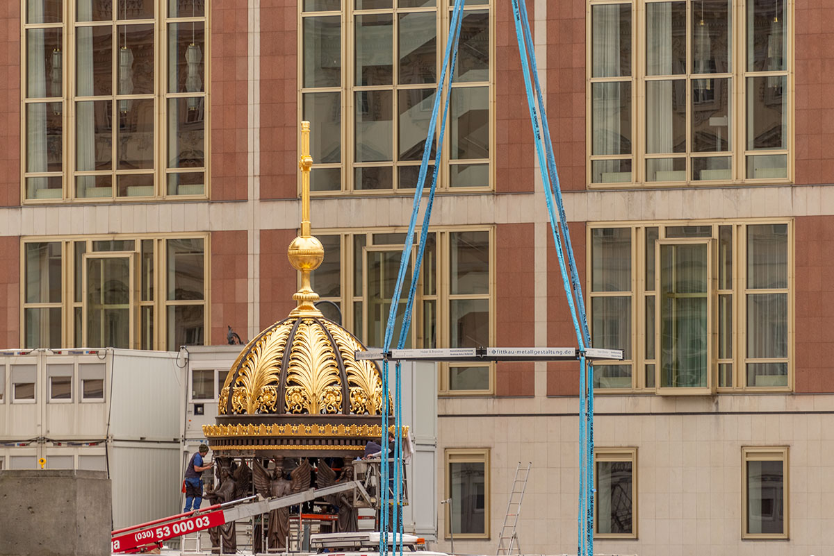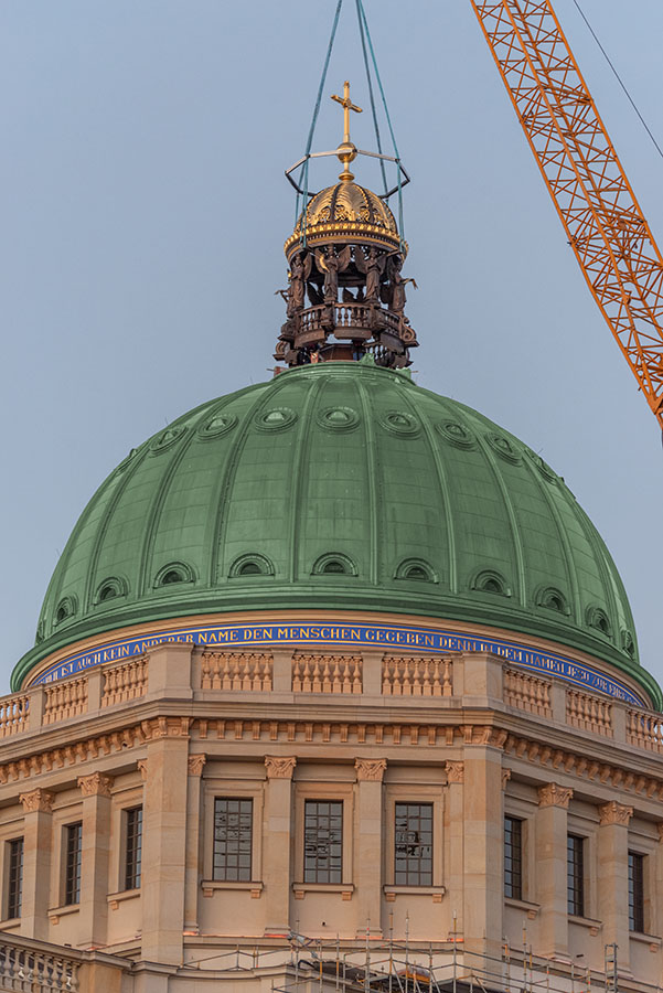 Heute gab’s Beschwerden. Ich hätte die Bilder der Krönung noch gar nicht veröffentlicht. Die Krönung des neu errichteten Berliner Stadtschlosses. Das stimmt zwar nicht ganz, in einem Fotoforum hatte ich sie bereits kurz nach dem freudigen Ereignis feierlich präsentiert, nur eben nicht hier, in diesem Blog. Nichts ist so alt, wie die News von gestern. Und die Bilder der Krönung sind inzwischen schon über drei Jahre alt. Aber vielleicht findet Ihr ja trotzdem Gefallen daran. Das letzte Bild mit dem grünen Dach ist übrigens gephotoshopt, wie man heutzutage sagt. Das Dach ist künstlich eingefärbt, zeigt aber heute schon, wie es in ein paar Jahren aussehen wird, wenn die Kupferplatten Grünspan angesetzt haben werden.