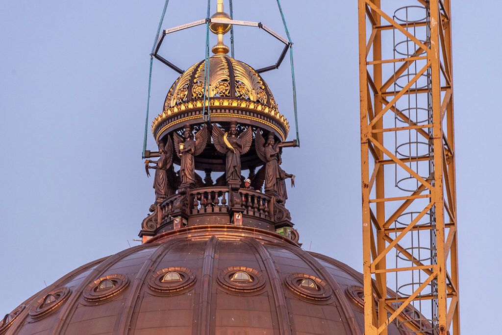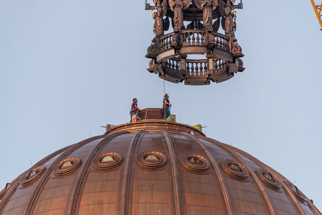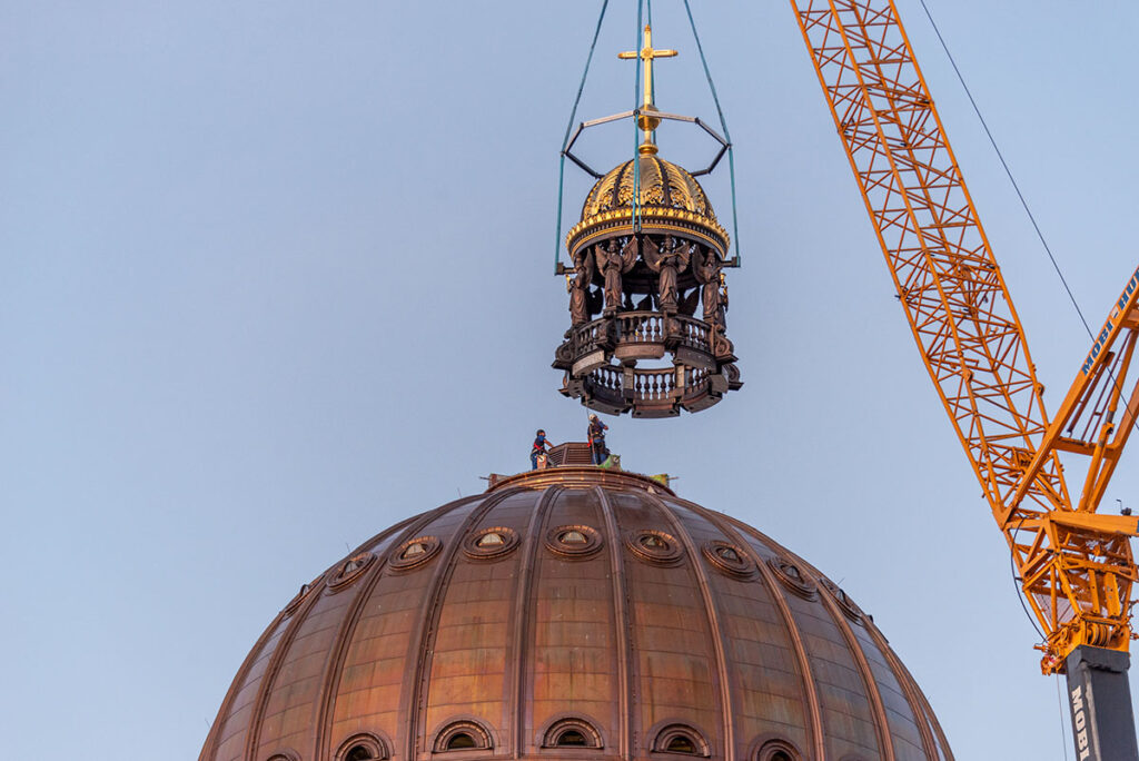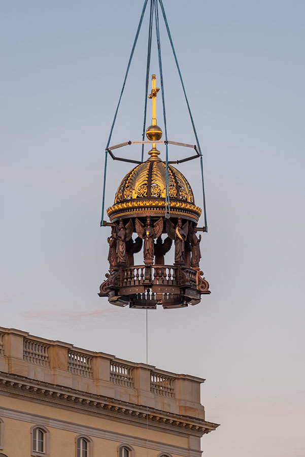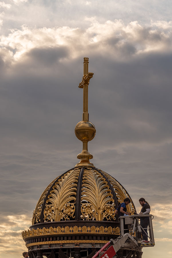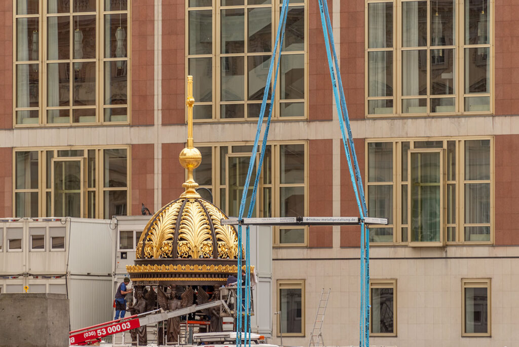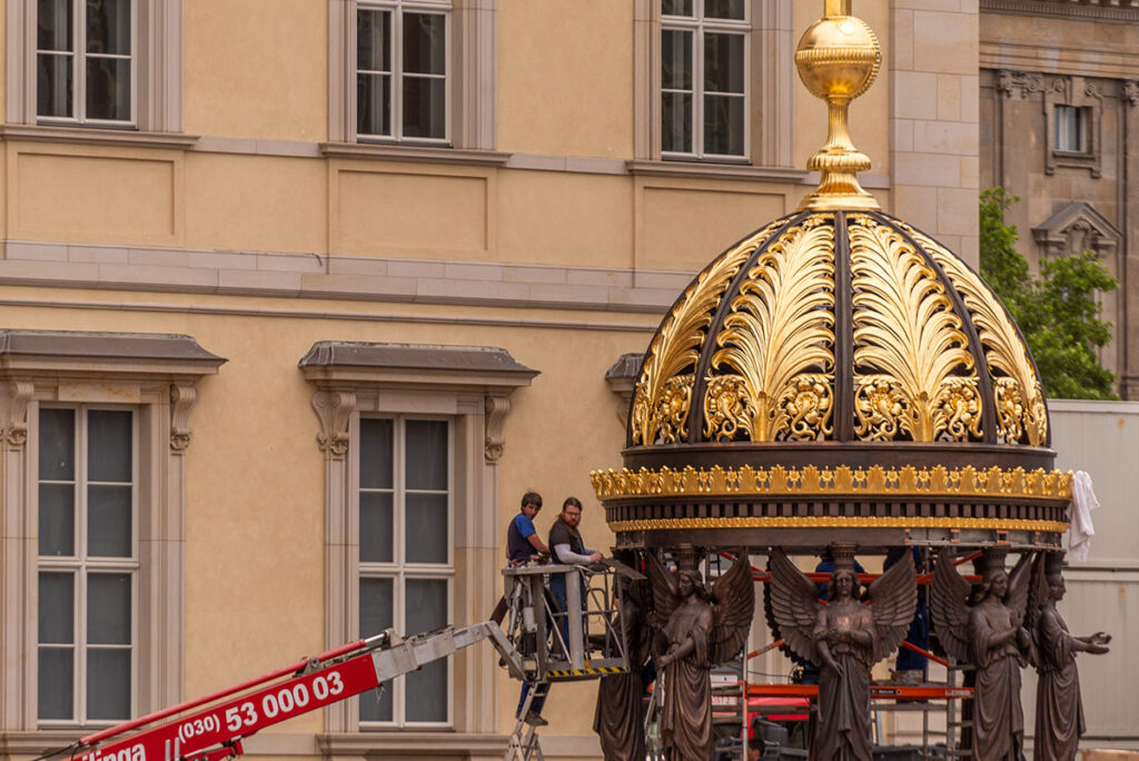 Heute gab’s Beschwerden. Ich hätte die Bilder der Krönung noch gar nicht veröffentlicht. Die Krönung des neu errichteten Berliner Stadtschlosses. Das stimmt zwar nicht ganz, in einem Fotoforum hatte ich sie bereits kurz nach dem freudigen Ereignis feierlich präsentiert, nur eben nicht hier, in diesem Blog. Nichts ist so alt, wie die News von gestern. Und die Bilder der Krönung sind inzwischen schon über drei Jahre alt. Aber vielleicht findet Ihr ja trotzdem Gefallen daran. Das letzte Bild mit dem grünen Dach ist übrigens gephotoshopt, wie man heutzutage sagt. Das Dach ist künstlich eingefärbt, zeigt aber heute schon, wie es in ein paar Jahren aussehen wird, wenn die Kupferplatten Grünspan angesetzt haben werden.