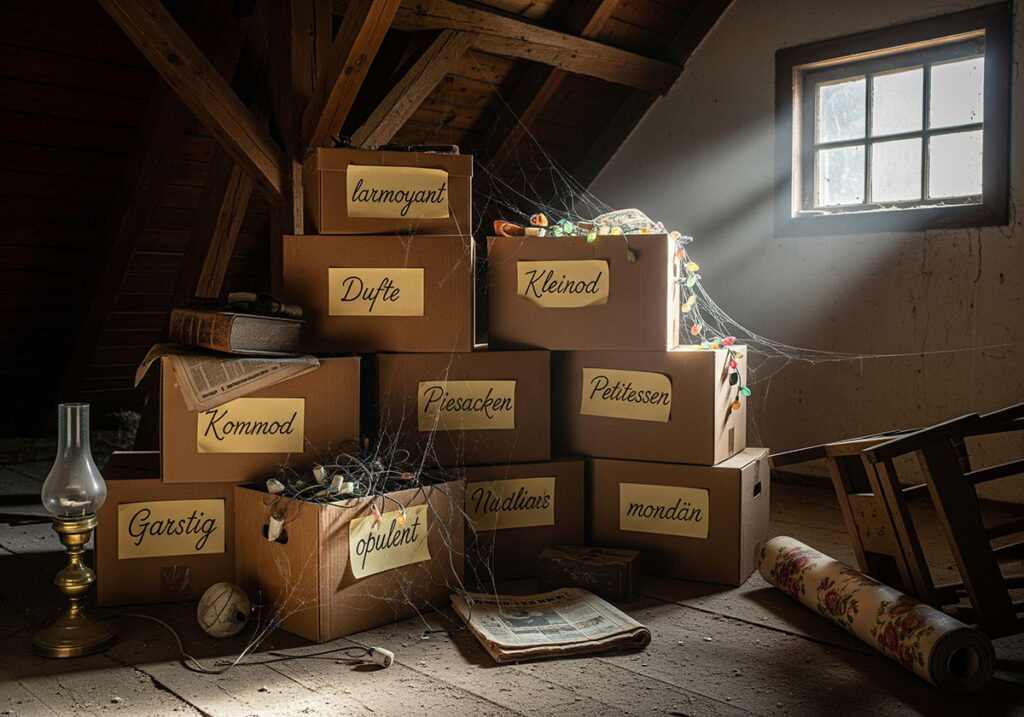 Unsere Sprache ist wie ein alter Dachboden: Zwischen verstaubten Truhen, vergessenen Möbeln und geheimnisvollen Briefen liegen auch Wörter, die im Alltag längst niemand mehr benutzt. Manche davon sind wahre Kleinode, andere wirken wie sprachliche Kuriositäten, die man nur noch in Omas Nähkästchen oder in vergilbten Romanen findet. Dort stößt man auf Begriffe, die heute fast wie Firlefanz wirken – und doch mehr Seele haben als so mancher moderne Modeausdruck.