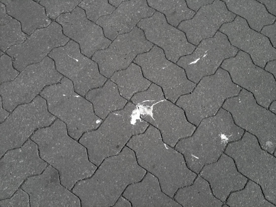 Holla! Da hätte ich mir doch gerade fast einen Anschiß eingehandelt! Keine zwei Meter von mir entfernt schlug nämlich soeben der unten abgebildete Vollformatflatschen auf dem Gehweg ein. Hätte ich den abbekommen, wäre ich aber ganz schön angekackt gewesen! Weil ich natürlich wissen wollte, welches Arschloch es diesmal wieder auf mich abgesehen hatte, blickte ich sogleich nach oben, doch der Attentäter war nirgends mehr auszumachen. Wohin ich auch blickte – nur schöner blauer Himmel …