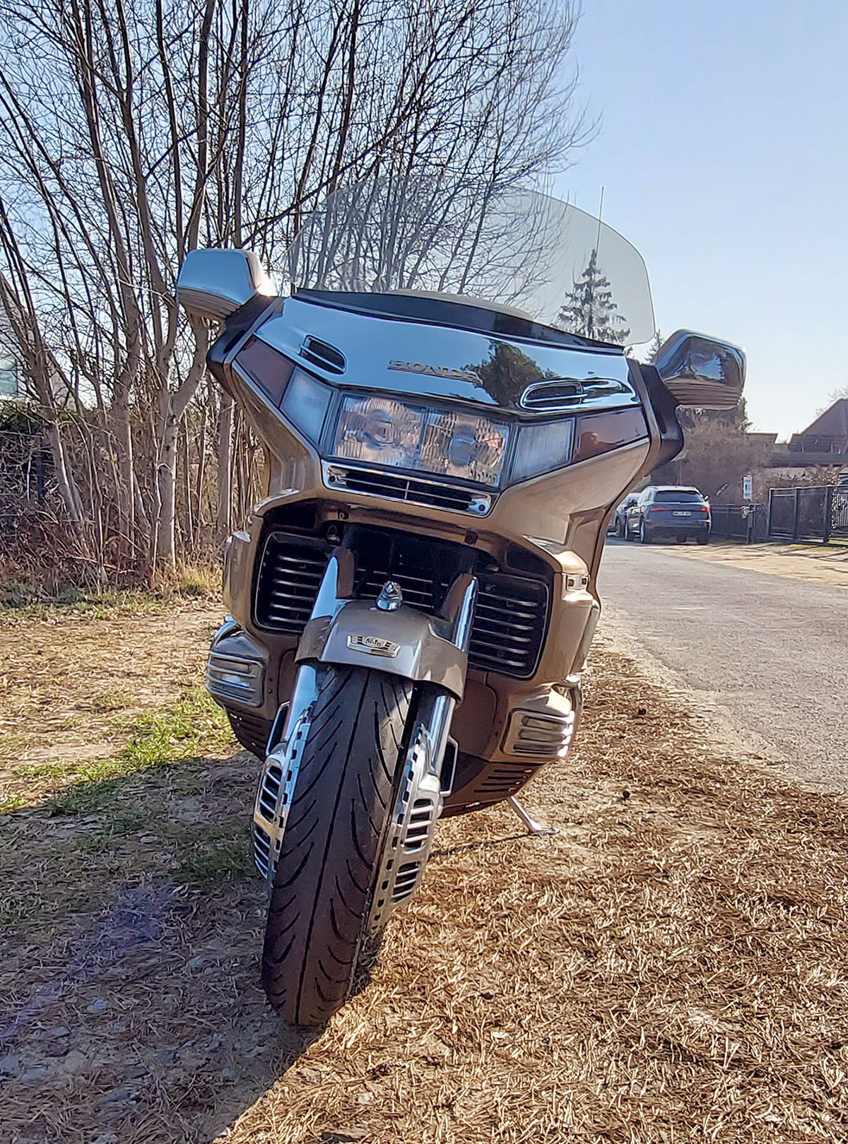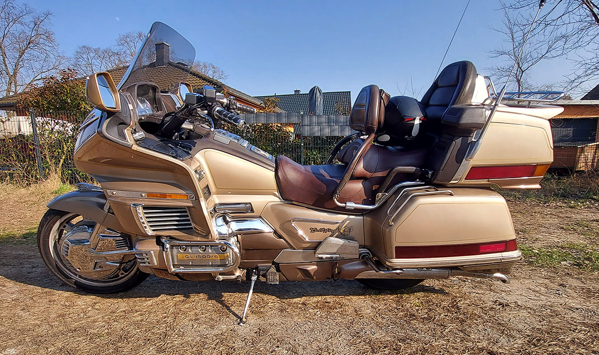Auch wenn ich Motorräder allgemein für einen Anachronismus halte, weil Fortbewegung auf zwei Rädern in meinen Augen gegenüber vierrädrigen Autos nur Nachteile hat – Fahrsicherheit, Wetteranfälligkeit, unangenehm enge, sich aufheizende Lederklamotten, kommunikationsabschottende Helme – statt Knautschzonen, Sicherheitsgurt und Airbag, T-Shirt, Shorts und luftige Sandalen, 8.1-300-Watt-High-End-Musikanlage inklusive Navigationssystem, beheizbare Sitze oder kühlende Klimaanlage – so fand ich diesen sechszylindrigen Zweirad-Repräsentanten aus den Achzigern durchaus extrem cool. Allein schon, weil er eine rückenschonende Lehne hat. Und einen Kassettenplayer.